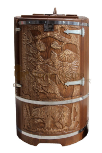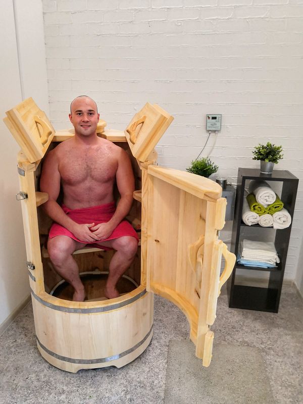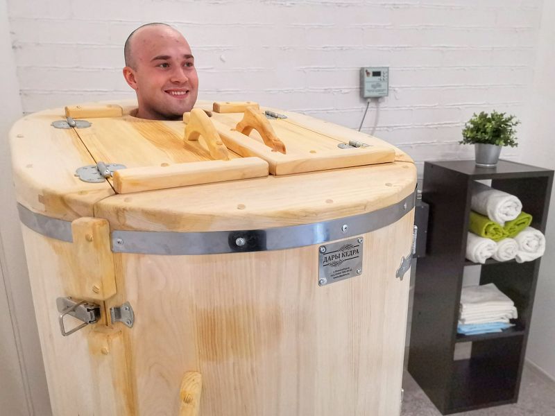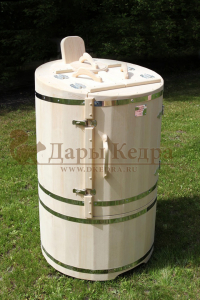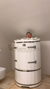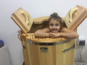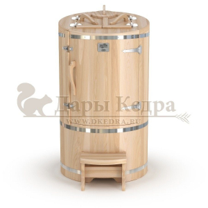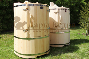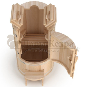 Круглая фитобочка из кедра - это мини парная, которую можно использовать не только в спа-салонах, но и дома. Такая модель наиболее компактна и мобильна. Толщина стенок составляет 40-45 мм, что позволяет увеличить срок службы изделия. Фитобочка оборудована откидными створками, дверцей и отверстием для головы. Верхний скос изделия делает положение головы более комфортным и улучшает обзор. Во время парения человек сидит внутри кедровой бочки, а голова находится снаружи. Благодаря этому исключается возможность перегрева. Подлокотники из кедра, встроенные ручки на створках и двери делают эксплуатацию более удобной.